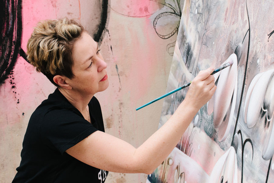 Artist Jean Bradbury at work on the murals for the Frolic Room.