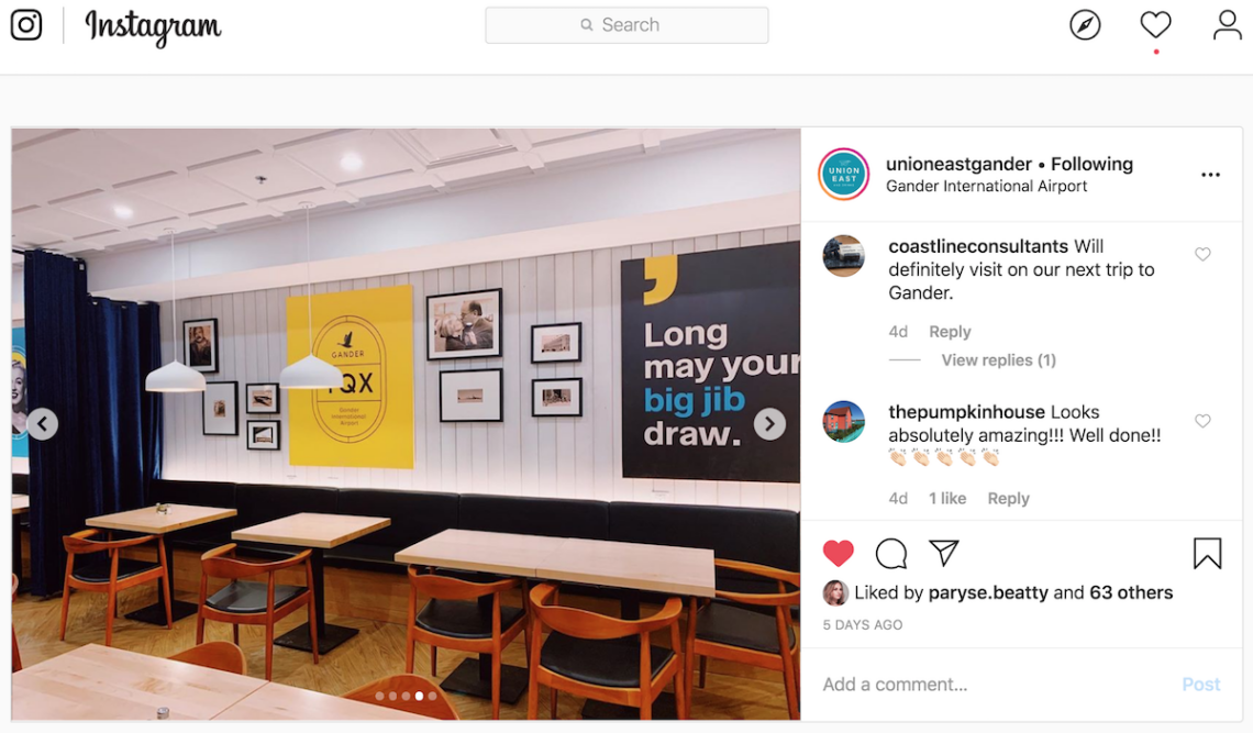 Union East and Drinks opened for business in 2019 as an early harbinger of the reemergence of Gander International Airport as a true community hub. Like its food, the name and design influences are locally born. The original Union East was a small and vibrant community located east of the Gander Airport in the 1940’s.